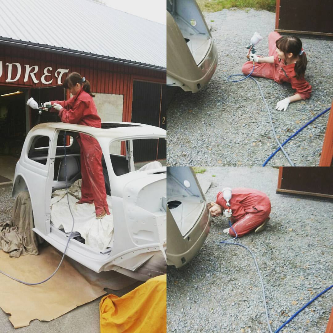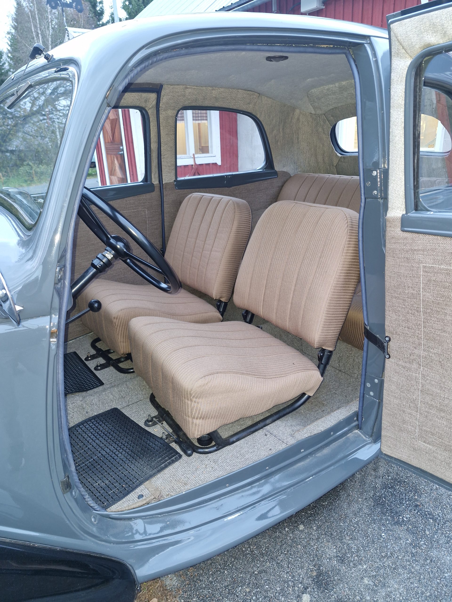 Jenny Karlsson som då var ny i föreningen fick komma in direkt i restaureringen genom att sy upp inredningen och gjorde också målningsarbetet av karossen med instruktioner av de äldre medlemmarna.